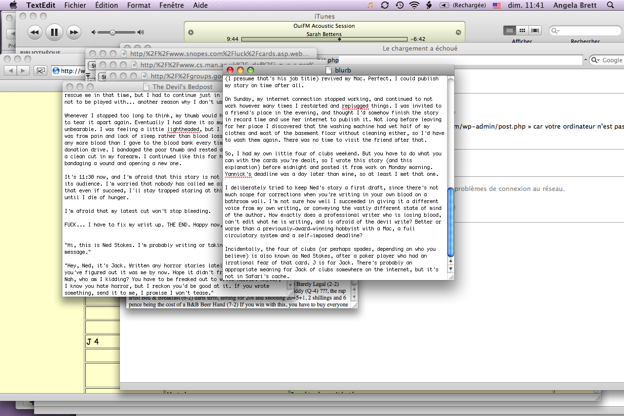 On Friday, my computer would not wake up. It did not have the slightest reaction when I pressed the power button, or held it down. I tried various things such as removing the battery and the power cord, but it didn’t help. I happened to pass by an Apple reseller on Friday afternoon, so they had a look of it and couldn’t immediately come up with a solution. When I mentioned this problem to Yannick, he dismissed my feeble excuse by claiming that once, a participant in such a game had got stuck in the toilet, and was found dead two weeks later, having written a story in blood. It seemed like the kind of situation which would lead to a cellphone vibrating against unfeeling skin, so I stole the idea.