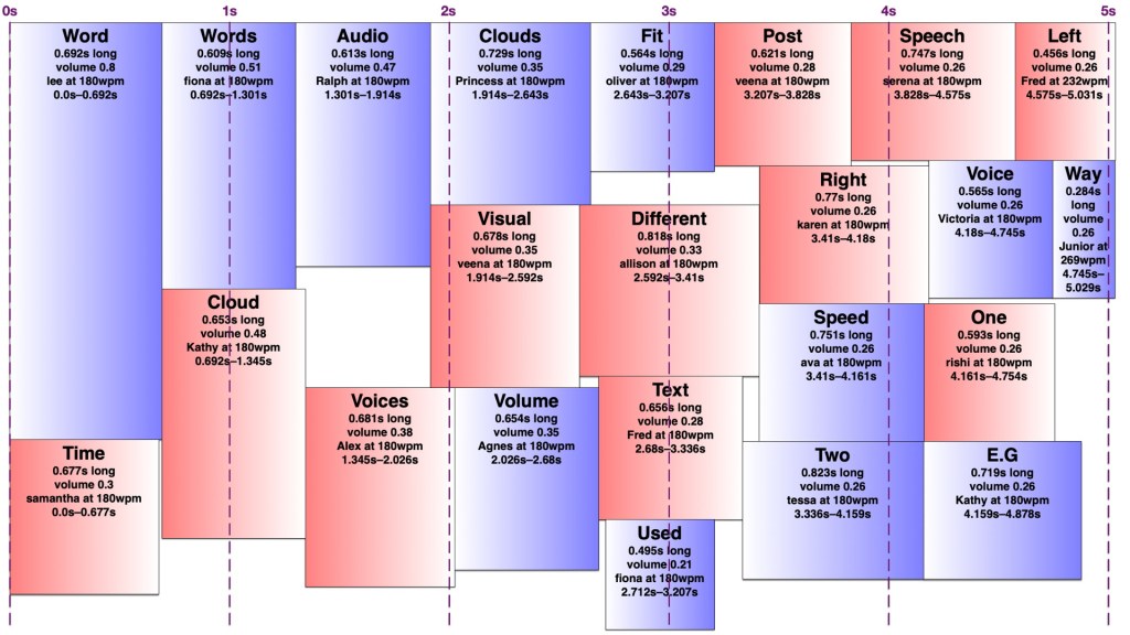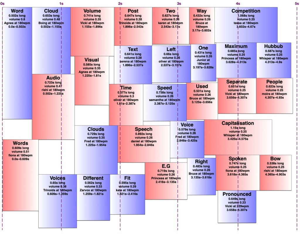 It turns out making an audio word cloud is simpler than making a visual one. There’s only one dimension in an audio word cloud — time. Volume could be thought of as sort of a second dimension, as my code would search through the time span for a free rectangle of the right duration with enough free volume. I later wrote an AppleScript to create ‘visual audio word clouds’ in OmniGraffle showing how the words fit into a time/volume rectangle. I’ve thus illustrated this post with a visual word cloud of this post, and a few audio word clouds and visual audio word clouds of this post with various settings.