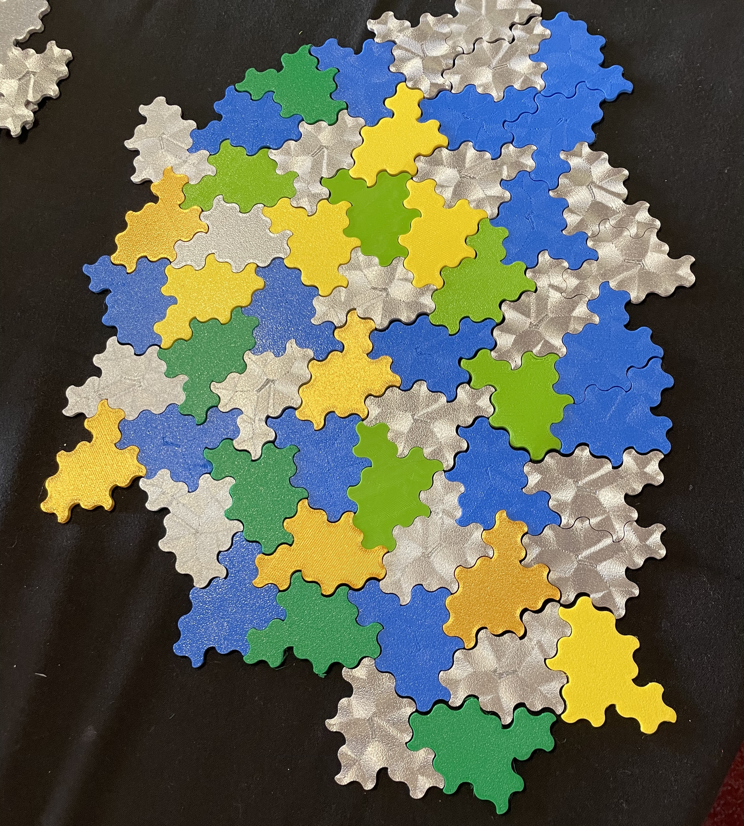 We didn’t sing This Tiling Never Repeats, because nobody (not even me) knew the music well enough. But on the Saturday of MathsJam, Joey and I wore Cirque du So What ‘I Want TILE!’ shirts, and I did in fact come away with a few handfuls of 3D-printed spectre aperiodic monotiles. Surprisingly, there were no aperiodic monotile shaped baked goods in the MathsJam BakeOff.