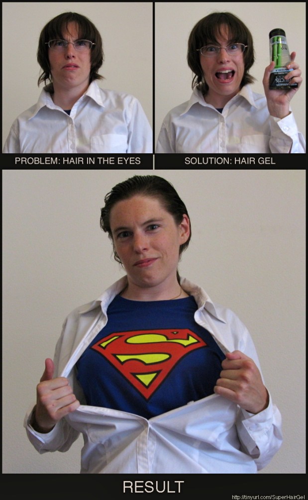 I wouldn’t be at all surprised if somebody else had already done this. I didn’t search, because I wanted to do it anyway. I had planned to wear a red bra over the top of the Superman T-shirt, but I forgot about it until a few hours after I posted this. Oh well; I remember Supergirl puts a bra on over the top of her clothes at one point in the movie, so it wouldn’t be so original for me to do it. Also, it probably would have looked terrible.