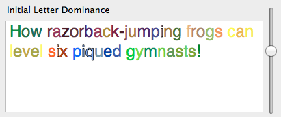 But even though this sample is using the ‘right’ colours for the letters, it still looks all wrong to me. When I think of a word, usually the colour of the word is dominated by the first letter. So I added another view with a slider, where you can choose how much the first letter of a word influences the colours of the rest of the letters in the word.